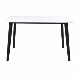 Vojens-pöydässä on tyylikkäät mustat jalat ja puhtaan valkoinen kansi.