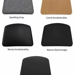 Tuoliin on valittavissa puiset istuin ja selkänoja ja niiden lisäksi verhoillut vaihtoehdot