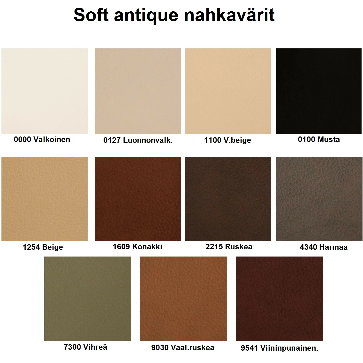 Verhoilu:Soft antique nahka ja keinonahka. Kulutuspinnat aitoa nahkaa, tausta keinonahkaa.