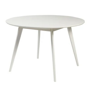 Tyylikäs Rowicon Yumi- pöytä puhtaanvalkoisena, pöydän vinot ja alaspäin kapenevat jalat antavat pöydälle kevyen ulkonäön. Pöydän halkaisija on 115 cm. joten sen ympärille sopii hyvin neljä tuolia.