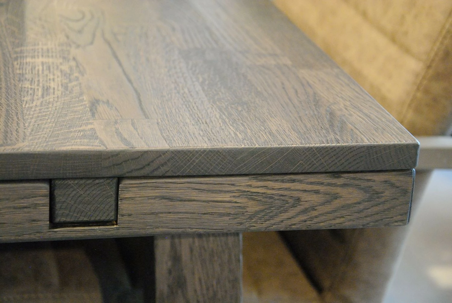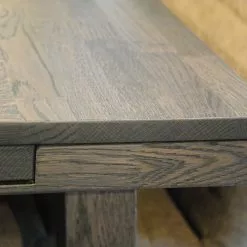 Tämä jykevä pöytä on valmistettu kokonaan tammesta, joka on petsattu ruskeaksi ja viimeistelty lakkaamalla.