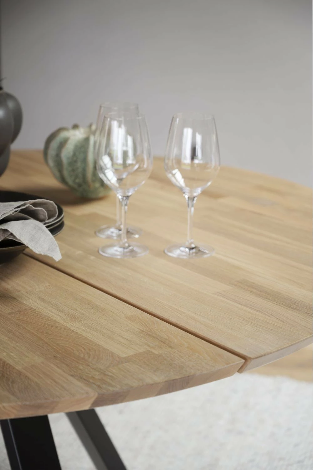 Pyöreän pöydän kanssa on helppo yhdistellä eri mallisia ja värisiä tuoleja, pöydän halkaisija on 150 cm joten siihen sopii ympärille 4-6 tuolia.