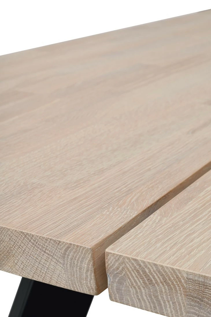 Pöydän kansi on valmistettu kokonaan tammesta joka on valkopesty ja lakattu. Pöydän tukevat jalat ovat pulverimaalattua metallia.
