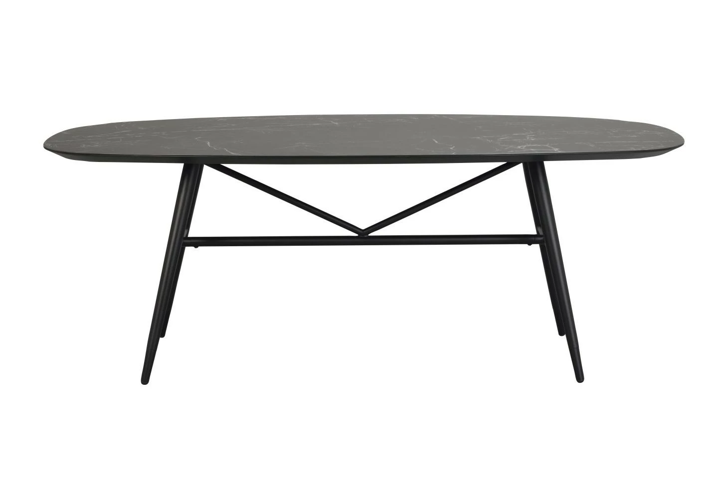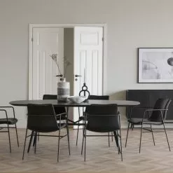 Musta Springdale-pöytä moderniin kotiin. Tässä Rowicon pöydässä yhdistyy trendikkäästi tukeva metallijalka ovaalin muotoiseen kanteen jossa on keraaminen pinnoite, jonka pinnassa on uniikki ulkonäkö. Springdale-sarjasta löytyy myös senkki.