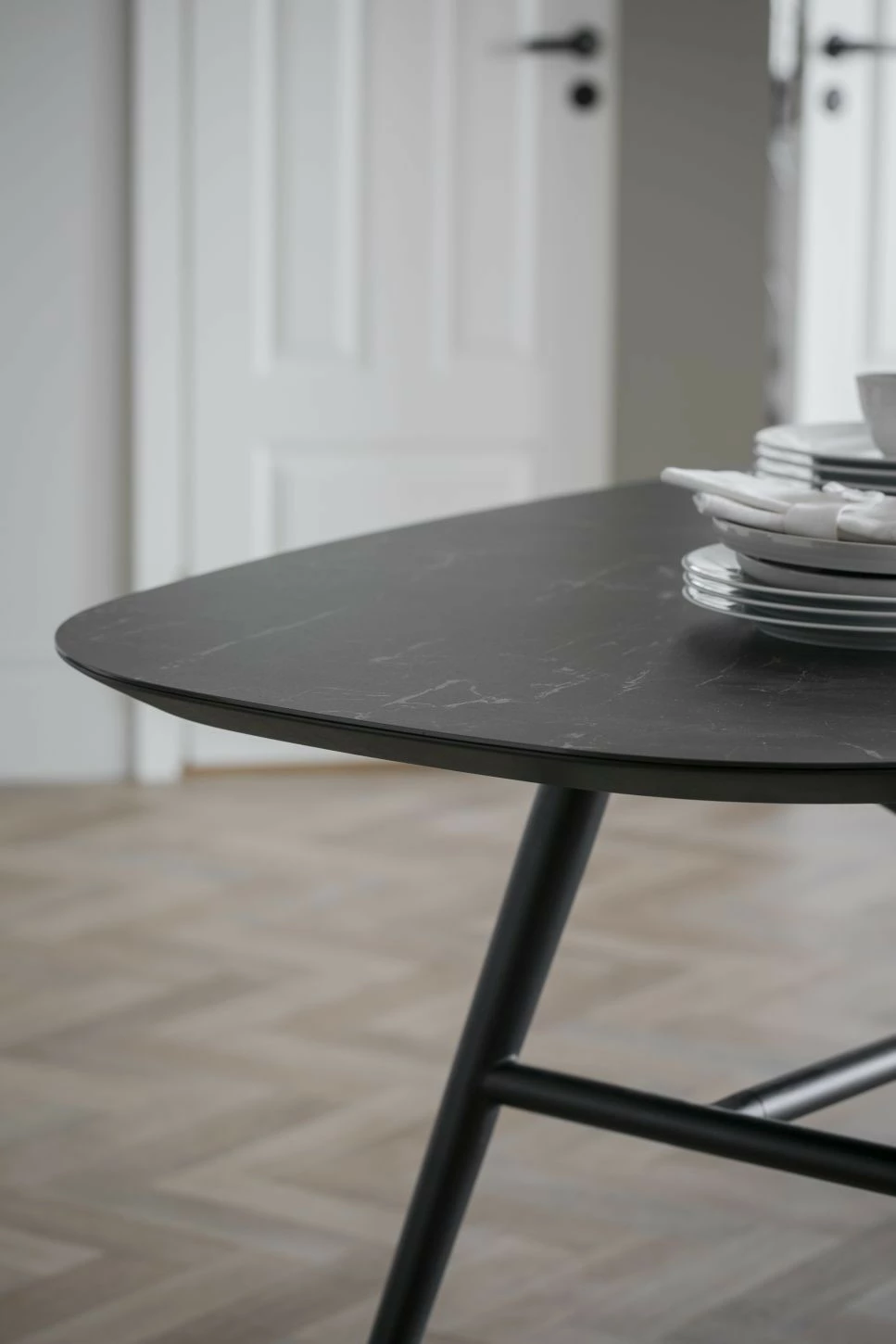 Moderni musta ruokapöytä ovaalinmuotoisena